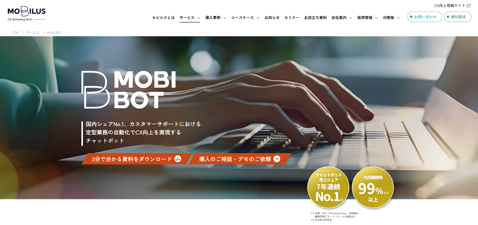 MOBI BOTは、問い合わせ対応だけでなく、申請や各種手続きをチャット上で完結できるAIチャットボットです。住所変更や申込処理などの定型業務を自動化できるため、コールセンターの呼量(入電数)削減や対応時間の短縮に貢献します。