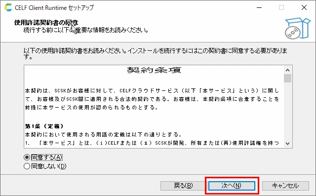 5. 使用許諾契約書の内容を確認いただき、「同意する」を選択後、「次へ」ボタンをクリックください。